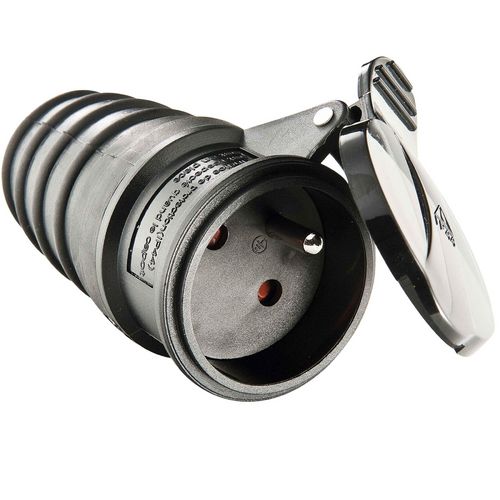 Fiche femelle 2 pôles + prise de terre. Corps en caoutchouc technique avec couvercle de protection contre l'humidité.