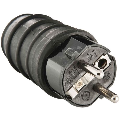 Fiche mâle 2 pôles + prise de terre. Corps en caoutchouc technique. Ces prises sont idéales contre l'humidité en caravaning, en bateau...