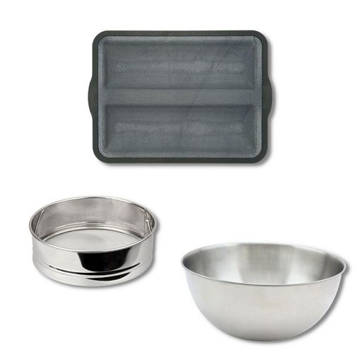 Dimensions : Moule : 36 x 26 x 2,5 cm | Tamis : 18 x 5 cm | Bol à mixer : Diamètre de 25cm