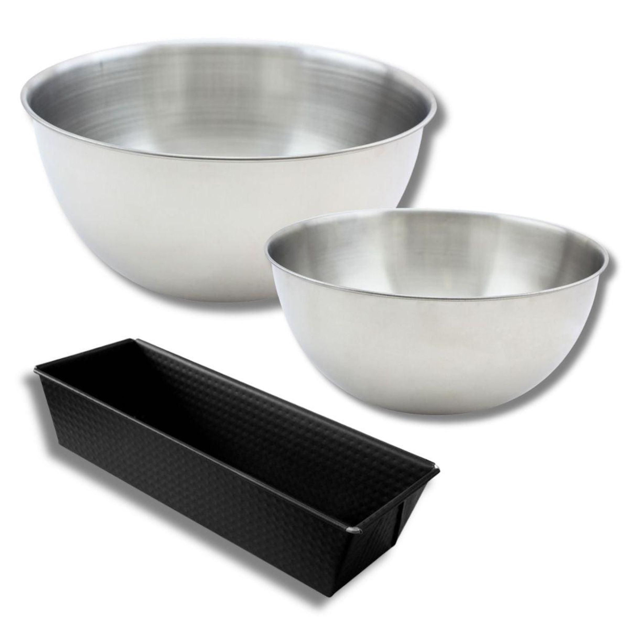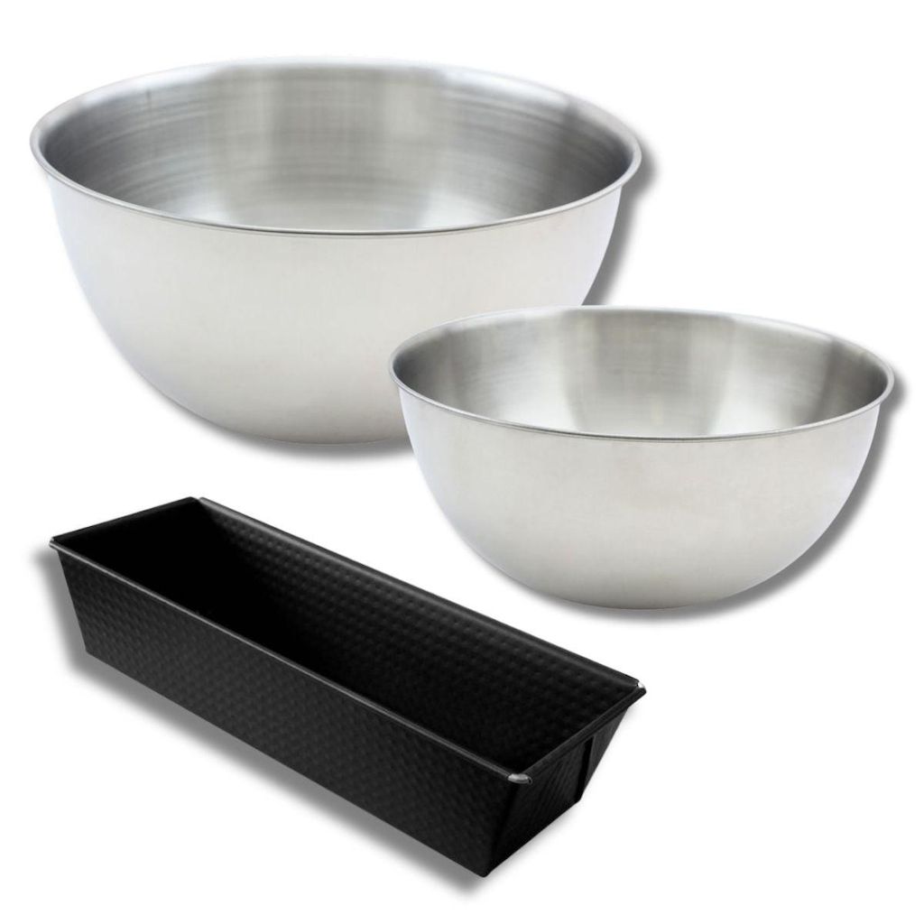 Ensemble avec 1 Moule à Cake 25,5cm, 1 spatule Zenker et 2 bols à mixer en inox Fackelmann