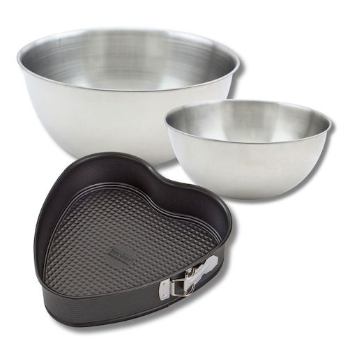 - DESCRIPTION: Ensemble comprenant un moule à gâteau cœur Zenker, deux bols inox Fackelmann (25 cm et 20,5 cm) et une spatule en silicone Zenker