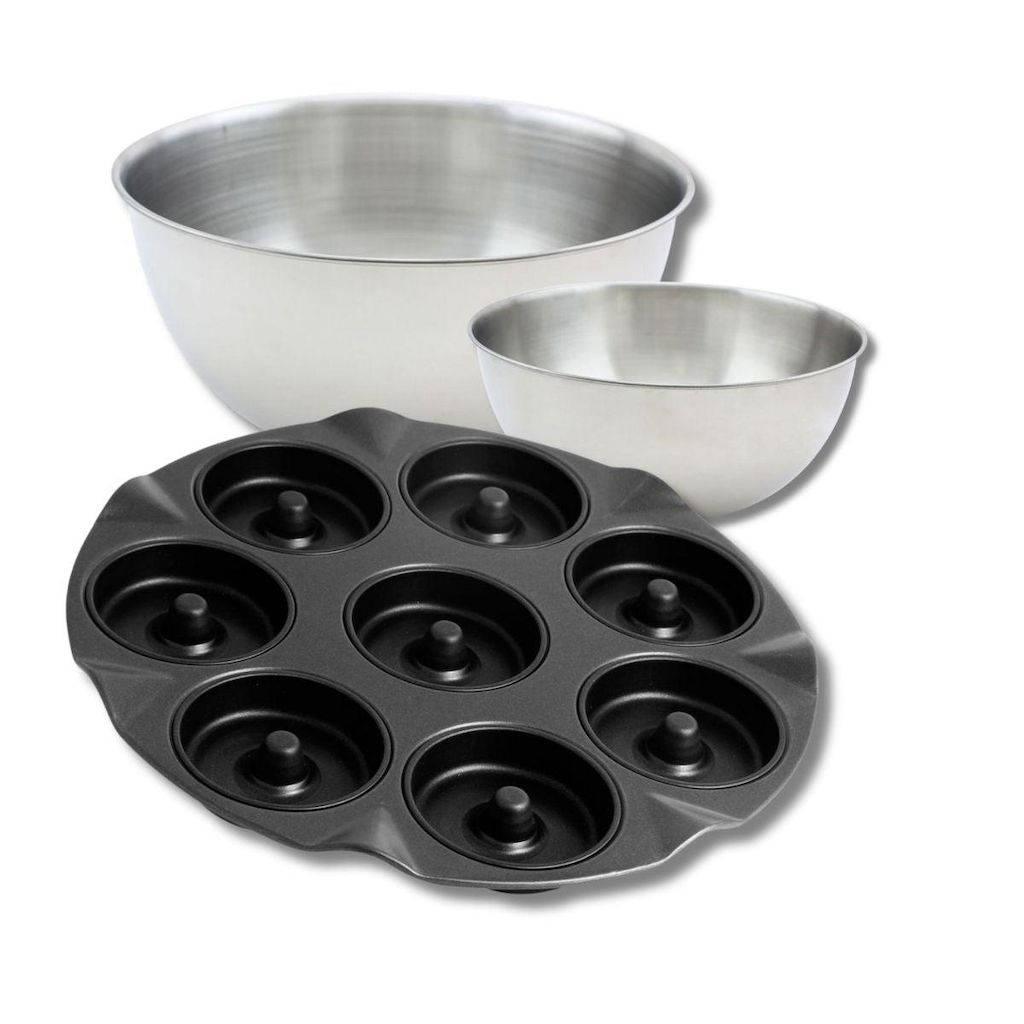 DESCRIPTION: Ensemble contenant un moule à beignets de 33 cm, deux bols à mixer de 25 cm et 20,5 cm, et une spatule de 25 cmPETIT +: La combinaison de ces ustensiles facilite toutes vos préparations culinaires, de la cuisson à la pâteCOMPOSITION: Acier inoxydable pour les bols et moule, silicone pou