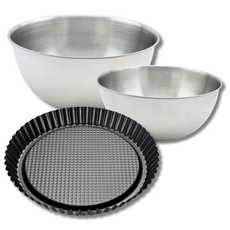 Ensemble comprenant 1 moule à tarte renversée 30 cm, 1 spatule Zenker et 2 bols à mixer en inox Fackelmann