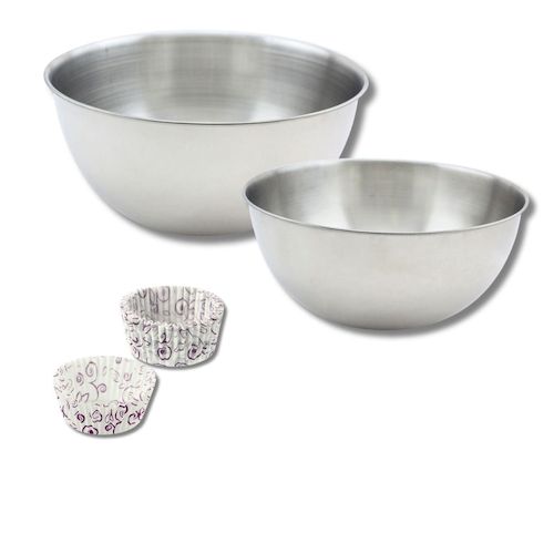 - DESCRIPTION: Ensemble composé de 50 moules à muffins, deux bols à mixer en inox et une spatule en silicone, idéal pour pâtisserie et cuisine