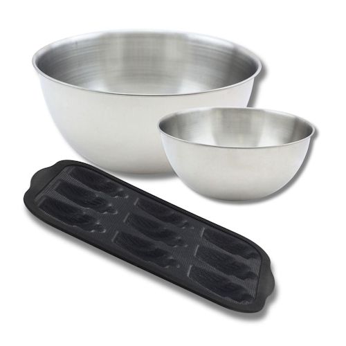Lot avec 1 Moule 9 madeleines en fibre de verre, 1 spatule Zenker et 2 bols à mixer en inox Fackelmann
