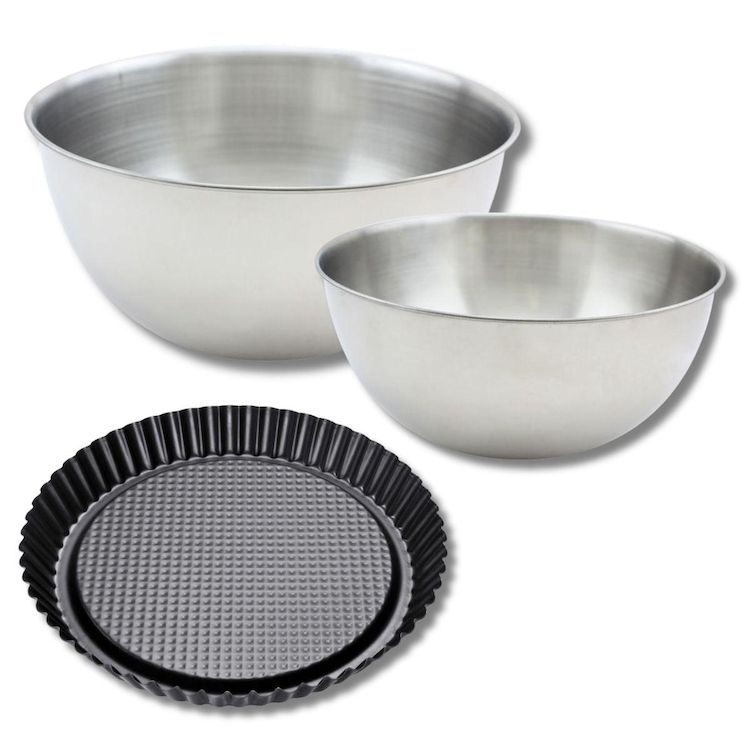 Lot avec 1 moule à tarte renversée 28 cm, 1 spatule Zenker et 2 bols à mixer en inox Fackelmann