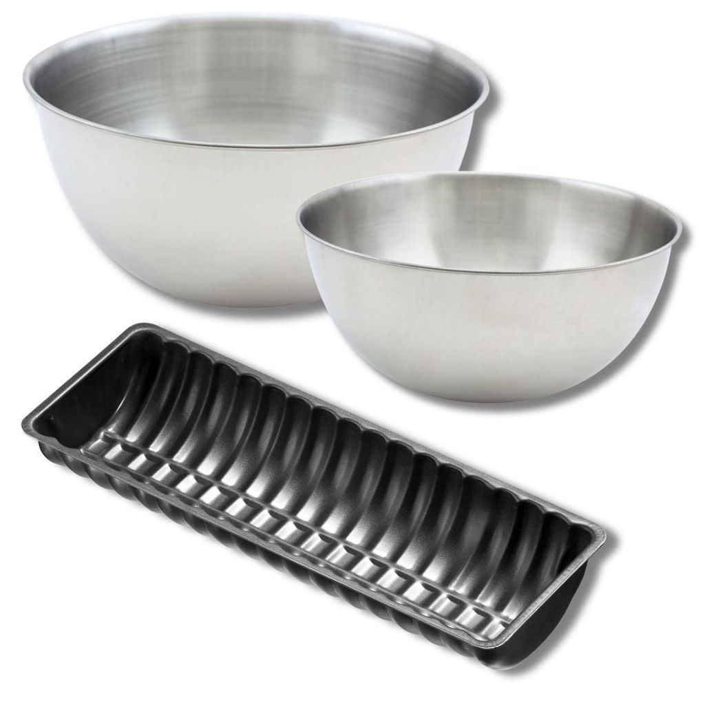 Lot comprenant 1 moule à buche de Noël, 1 spatule Zenker et 2 bols à mixer en inox Fackelmann