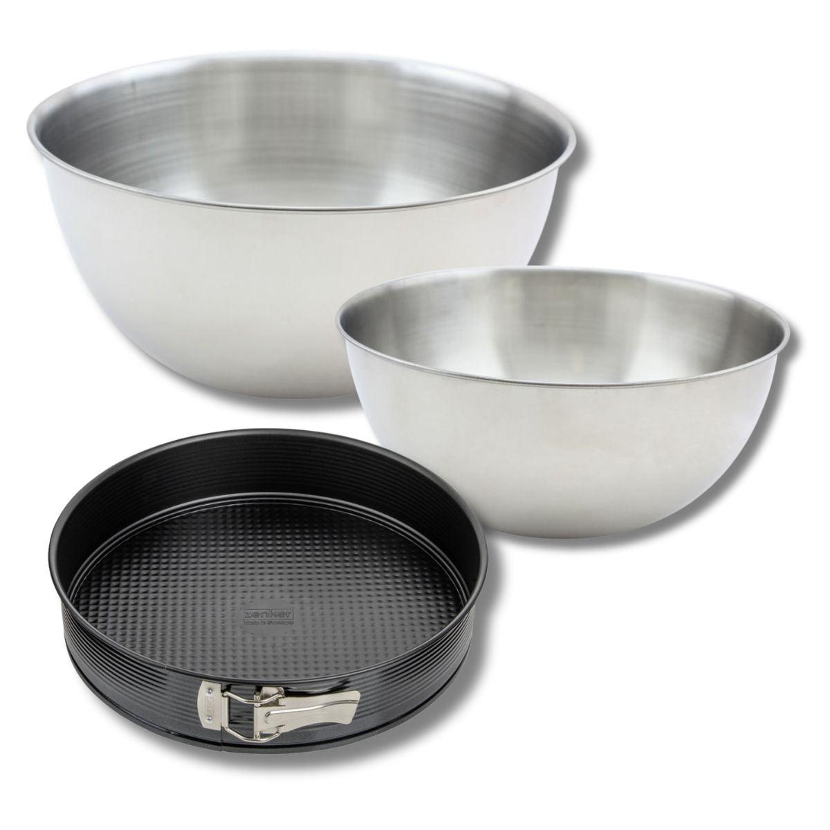 Lot comprenant 1 Moule à manqué 24 cm, 1 spatule Zenker et 2 bols à mixer en inox Fackelmann