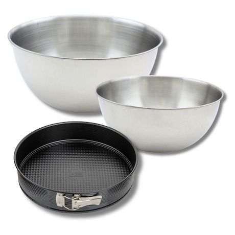 - DESCRIPTION: Ensemble composé d'un moule à manqué de 24 cm, de deux bols à mixer de 20,5 et 25 cm en inox, et d'une spatule en silicone de 25 cm