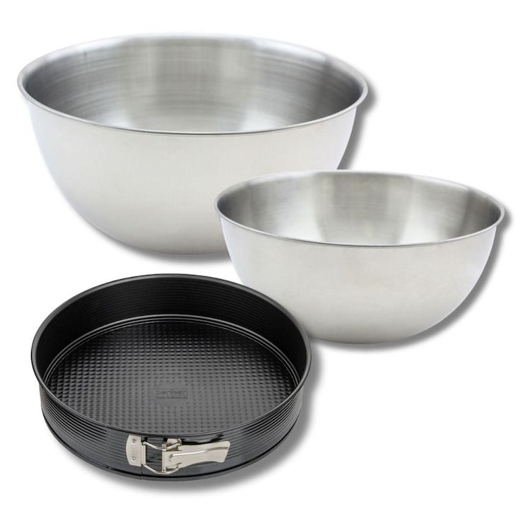 DESCRIPTION: Ensemble composé d'un moule à manqué de 24 cm, de deux bols à mixer de 20,5 et 25 cm en inox, et d'une spatule en silicone de 25 cmPETIT +: La combinaison parfaite pour tous vos besoins de pâtisserie et de cuisine, de la préparation à la cuissonCOMPOSITION: Moule en acier avec revêtemen