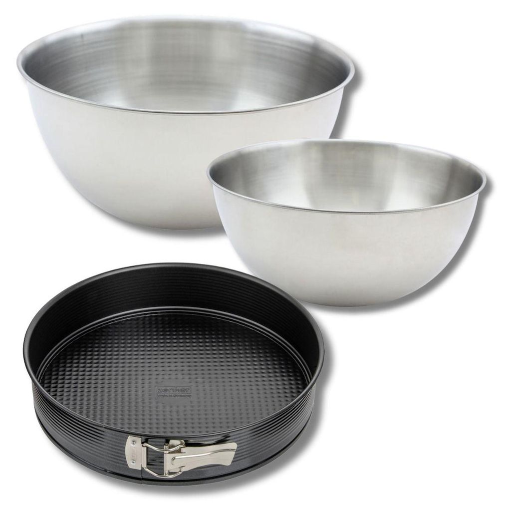 DESCRIPTION: Ensemble de pâtisserie comprenant un moule à manqué à charnière de 28 cm, deux bols à mixer en inox de 25 cm et 20,5 cm, et une spatule en silicone de 25 cmPETIT +: Ce lot combine des ustensiles de haute qualité, idéaux pour pâtisserie et cuisine, facilitant votre expérience culinaireCO