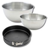 - DESCRIPTION: Ensemble de pâtisserie comprenant un moule à manqué à charnière de 28 cm, deux bols à mixer en inox de 25 cm et 20,5 cm, et une spatule en silicone de 25 cm