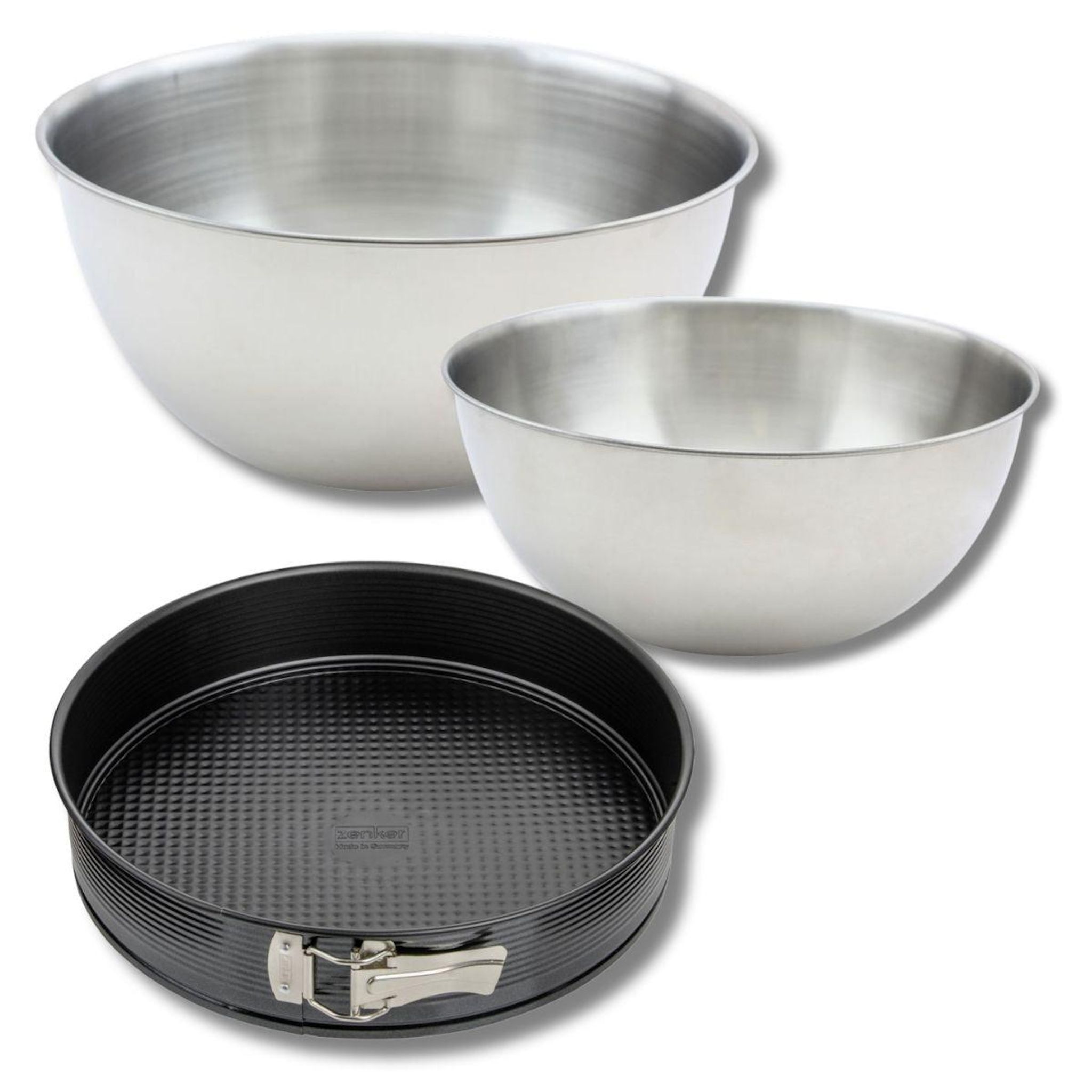Lot comprenant 1 Moule à manqué 28 cm, 1 spatule Zenker et 2 bols à mixer en inox Fackelmann
