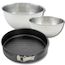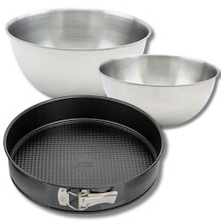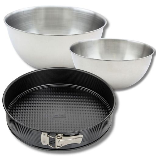 - DESCRIPTION: Ensemble de pâtisserie incluant un moule à manqué de 30 cm, deux bols à mixer en inox de 25 cm et 20,5 cm, et une spatule de 25 cm, parfait pour toutes vos créations