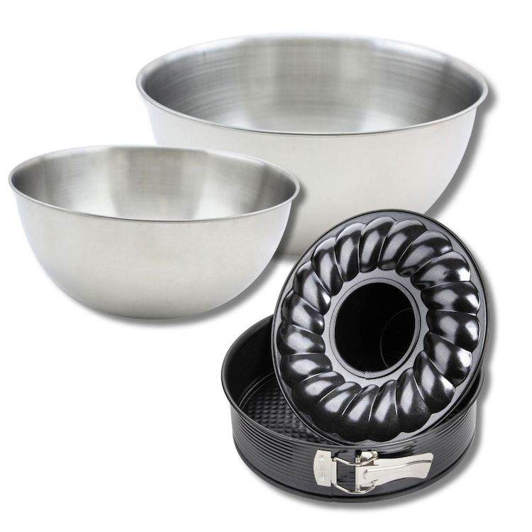 Lot comprenant 1 Moule à manqué et à savarin 26 cm, 1 spatule Zenker et 2 bols à mixer en inox Fackelmann