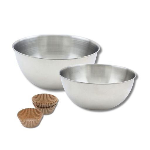 - DESCRIPTION: Cet ensemble comprend 40 moules à muffins en papier, deux bols à mixer en inox et une spatule, idéal pour pâtisserie et cuisine