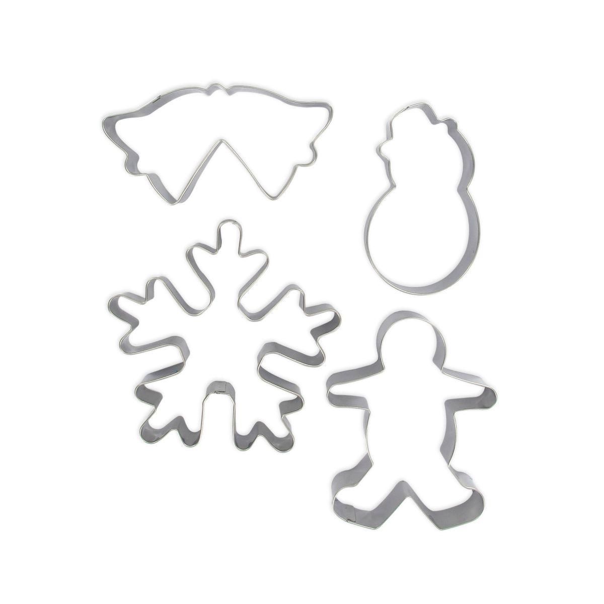 - DESCRIPTION : Set d'emporte-pièces de Noël composé de 4 éléments : un bonhomme de neige, une double cloche, un flocon de neige et un homme en pain d'épices