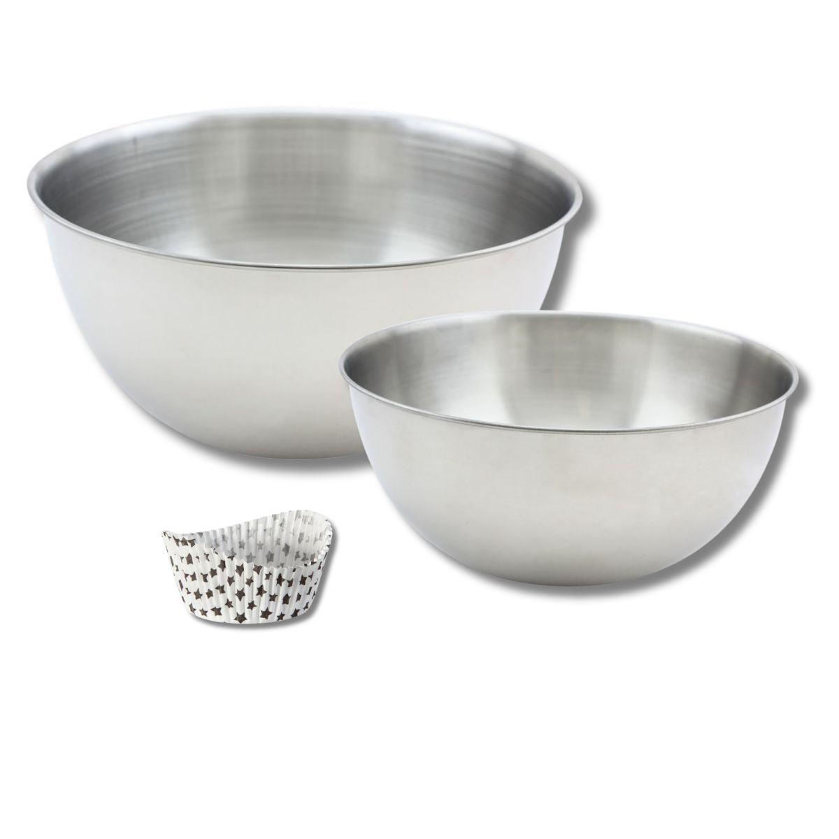- DESCRIPTION: Ensemble de pâtisserie comprenant 50 moules à muffins en papier, 2 bols en inox et une spatule en silicone, idéal pour la cuisine et la pâtisserie