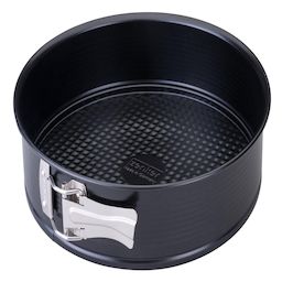 - DESCRIPTION: Moule à charnière de 24 cm, idéal pour gâteaux ronds et fonds de tartes. Double revêtement antiadhésif pour un démoulage aisé et bord gaufré pour une stabilité renforcée.