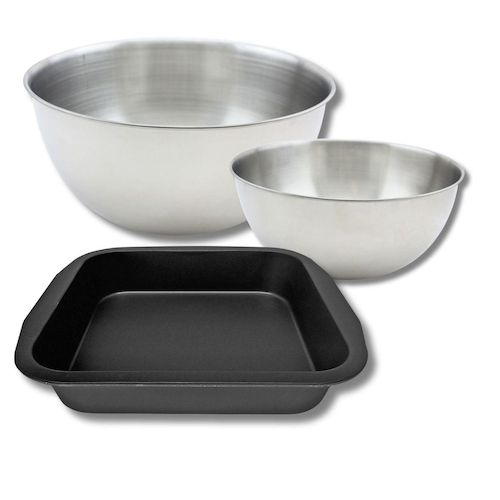 DESCRIPTION: Ensemble de pâtisserie incluant un moule à brownie Zenker, deux bols à mixer Fackelmann et une spatule en silicone. Parfait pour vos créations culinairesPETIT +: La combinaison de ces ustensiles vous permet de réaliser une variété de préparations, de la pâtisserie à la cuisine quotidien