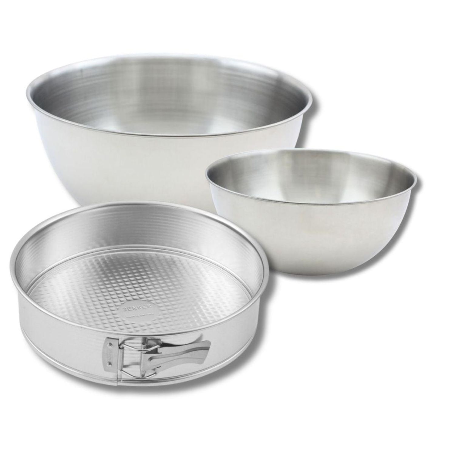 Set comprenant 1 Moule à manqué charnière 28 cm, 1 spatule Zenker et 2 bols à mixer en inox Fackelmann