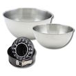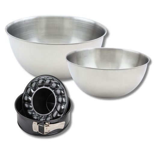 - DESCRIPTION: Lot comprenant un moule à manqué de 18 cm, deux bols en inox (25 cm et 20,5 cm) et une spatule en silicone de 25 cm. Parfait pour pâtisserie et cuisine
