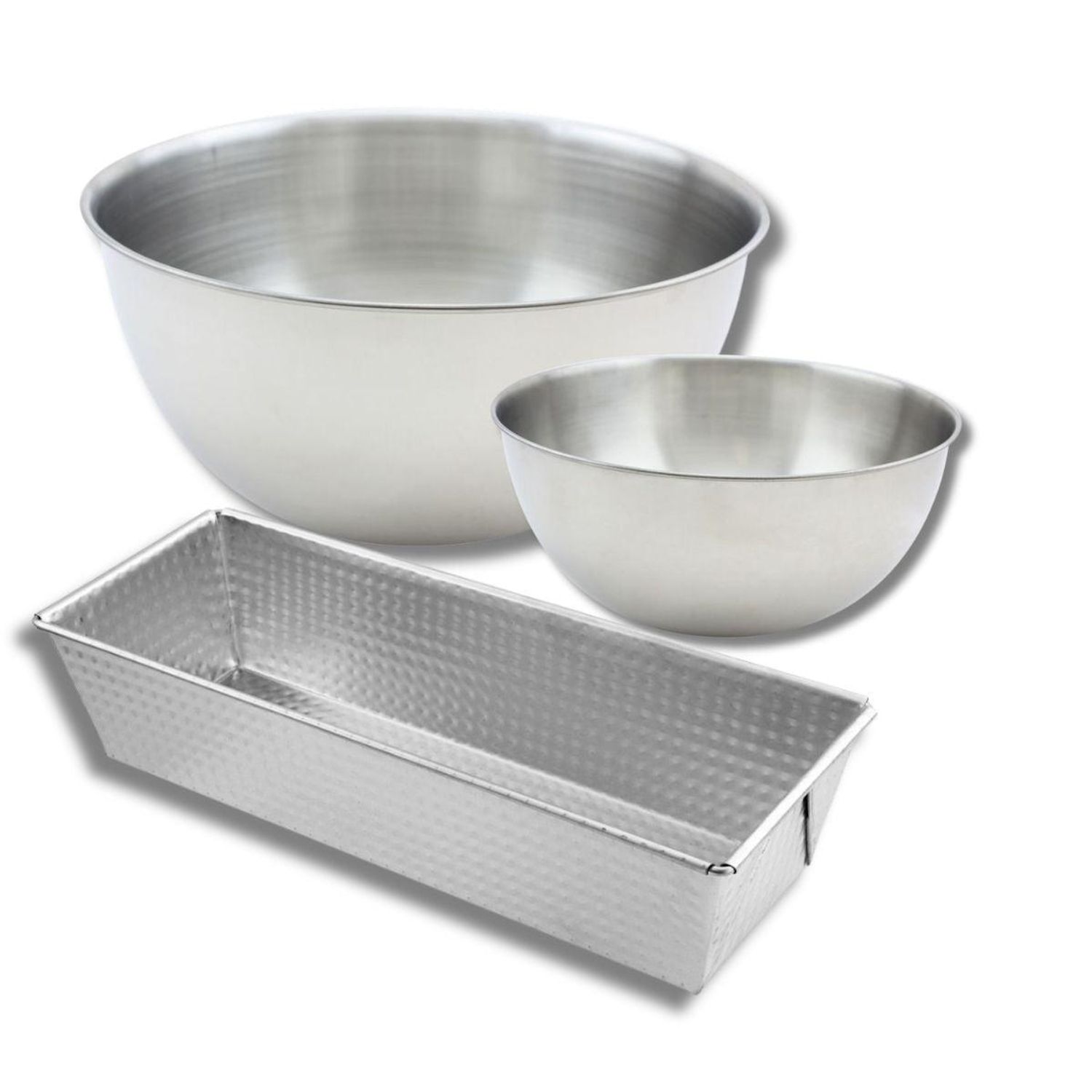 Set de pâtisserie avec 1 Moule Cake 30cm, 1 spatule Zenker et 2 bols à mixer en inox Fackelmann