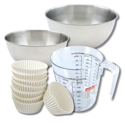 - COMPOSITION: Moules papier blanc faits en UE, bols acier inox, verre doseur en plastique, spatule silicone et plastique