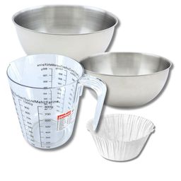 - COMPOSITION: Moules papier, faits en UE, bols acier inox, verre doseur en plastique, spatule silicone et plastique