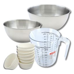 - DESCRIPTION: Set à pâtisserie avec 75 moules à muffins en papier, 2 bols à mixer inox de 25 et 20,5 cm, verre mesureur 1L, spatule en silicone de 25 cm