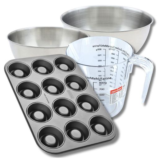 Set pâtisserie avec moule à 12 babas au rhum 38,5 x 26,5 cm en acier, 2 bols à mixer, verre mesureur et spatule Zenker