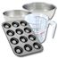 - DESCRIPTION: Ensemble de pâtisserie comprenant un moule à 12 babas, deux bols à mixer en inox, une spatule en silicone et un verre doseur