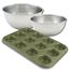 - DESCRIPTION: Set à pâtisserie avec 1 moule à muffins 12 empreintes Zenker Green Vision antiadhésif, 2 bols à mixer en inox de 25 cm et 20,5 cm, et 1 spatule en silicone de 25 cm