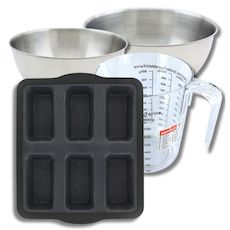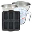 DESCRIPTION: Lot d'ustensiles de pâtisserie incluant un moule à financiers, deux bols en inox, une spatule en silicone et un verre doseur, parfait pour vos recettesPETIT +: La combinaison de ces ustensiles vous permet de réaliser facilement des pâtisseries variées, tout en optimisant votre temps en
