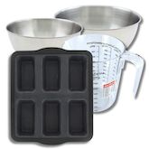 - DESCRIPTION: Lot d'ustensiles de pâtisserie incluant un moule à financiers, deux bols en inox, une spatule en silicone et un verre doseur, parfait pour vos recettes