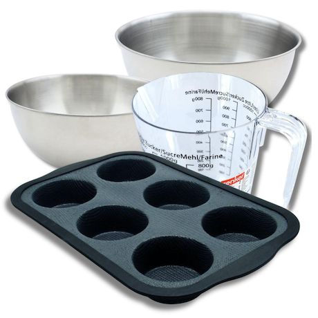 - DESCRIPTION: Cet ensemble comprend un moule à muffins Zenker, deux bols à mixer Fackelmann en inox, une spatule en silicone et un verre doseur Zenker, parfait pour vos recettes