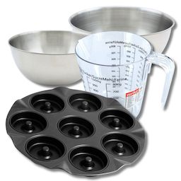 - DESCRIPTION: Ensemble d'ustensiles de pâtisserie comprenant un moule à beignets de 33 cm, deux bols inox de 25 cm et 20.5 cm, une spatule de 25 cm et un verre doseur de 1 litre