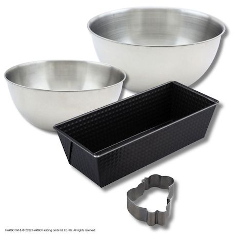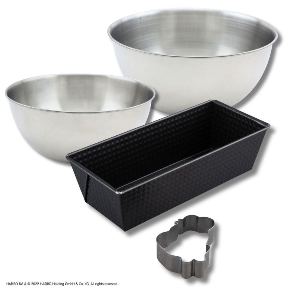 - DESCRIPTION: Set à pâtisserie avec 1 moule à cake 25 cm Zenker Haribo et un emporte-pièce motif ours, 2 bols à mixer en inox de 25 cm et 20,5 cm, 1 spatule en silicone de 25 cm