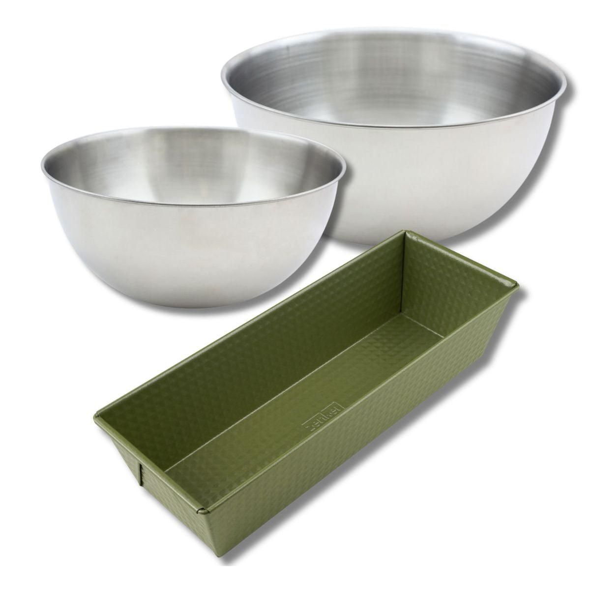 - DESCRIPTION: Set à pâtisserie avec 1 moule à cake 30 cm Zenker Green Vision antiadhésif, 2 bols à mixer en inox de 25 cm et 20,5 cm, et une spatule en silicone de 25 cm