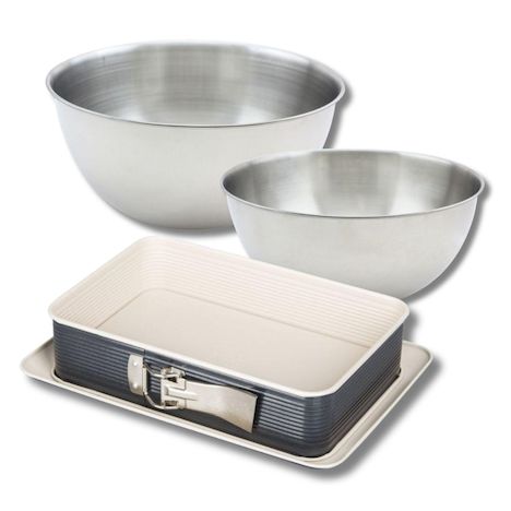 - DESCRIPTION: Set à pâtisserie avec 1 moule à charnière 28 x 18 cm Zenker antiadhésif, 2 bols à mixer en inox de 25 cm et 20,5 cm, et une spatule en silicone de 25 cm
