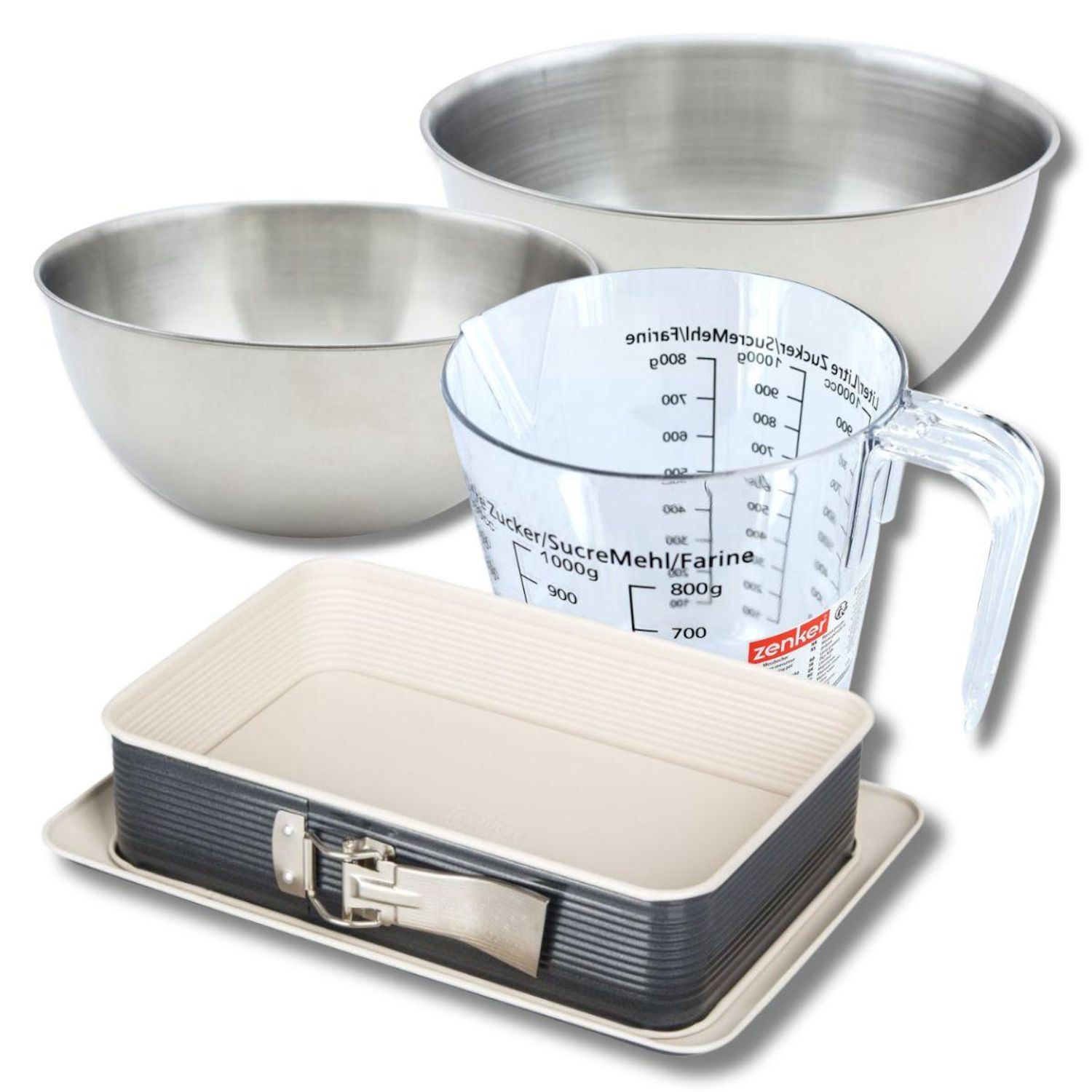 Set pâtisserie avec moule à charnière 28 x 18 cm, 2 bols à mixer, verre mesureur et spatule Zenker