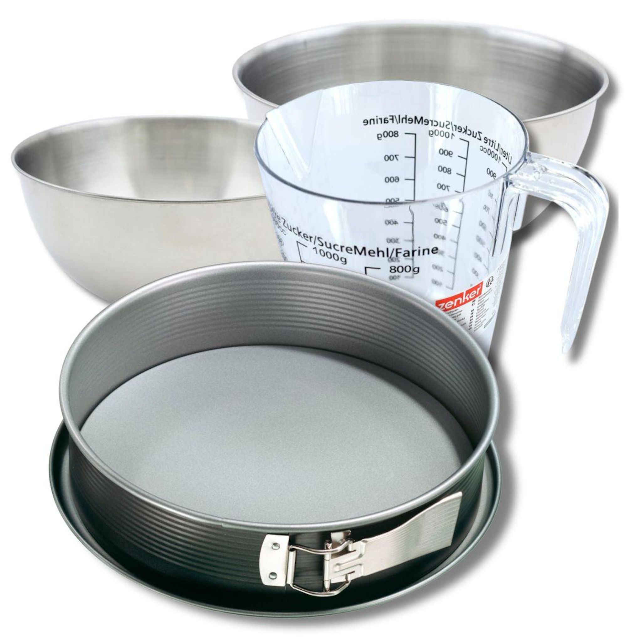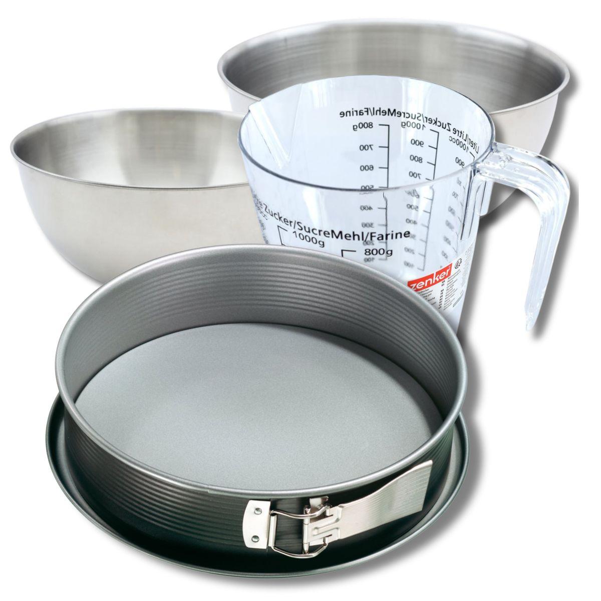 Set pâtisserie avec moule à manqué de 28 cm acier, 2 bols à mixer, verre mesureur et spatule Zenker