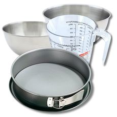 - DESCRIPTION: Ensemble d'ustensiles de pâtisserie incluant un moule à manqué Zenker, deux bols Fackelmann en inox, une spatule Zenker et un verre doseur
