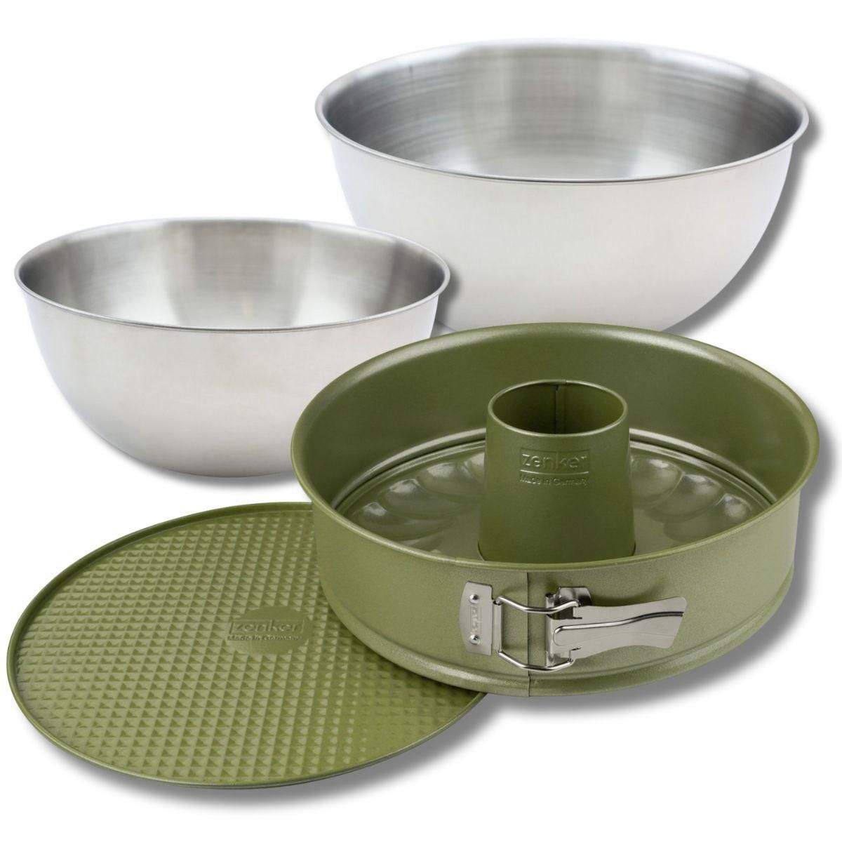 - DESCRIPTION: Set à pâtisserie avec 1 moule 26 cm à manqué et à savarin Zenker, avec charnière , antiadhésif, 2 bols à mixer en inox de 25 cm et 20,5 cm, et une spatule en silicone de 25 cm
