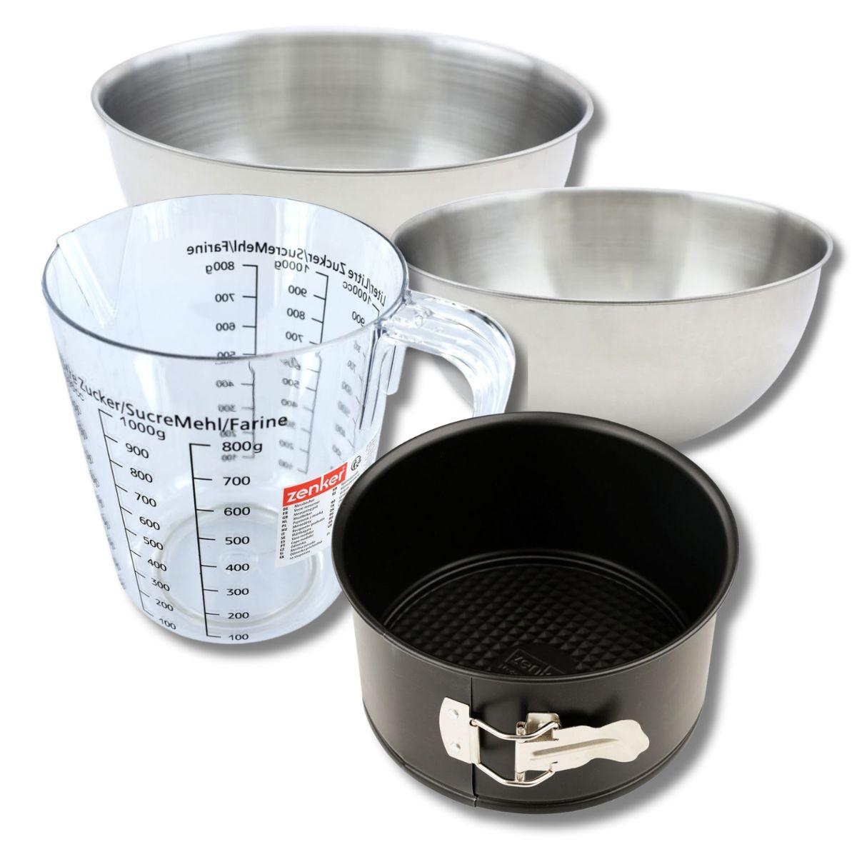 - DESCRIPTION: Set à pâtisserie avec un moule à panettone 18 cm à charnière antiadhésif Zenker, deux bols inox (25 cm et 20,5 cm), une spatule en silicone 25 cm, et un verre doseur 1L