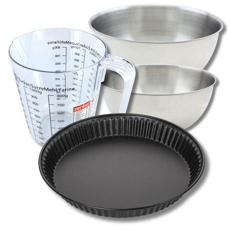 - DESCRIPTION: Set à pâtisserie avec un moule à quiches 28 cm antiadhésif Zenker, deux bols inox (25 cm et 20,5 cm), une spatule en silicone 25 cm, et un verre doseur 1L