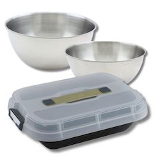- DESCRIPTION: Set à pâtisserie avec moule à gâteaux 34 x 24 cm avec couvercle, 2 bols à mixer en inox de 25 cm et 20,5 cm, et une spatule en silicone de 25 cm