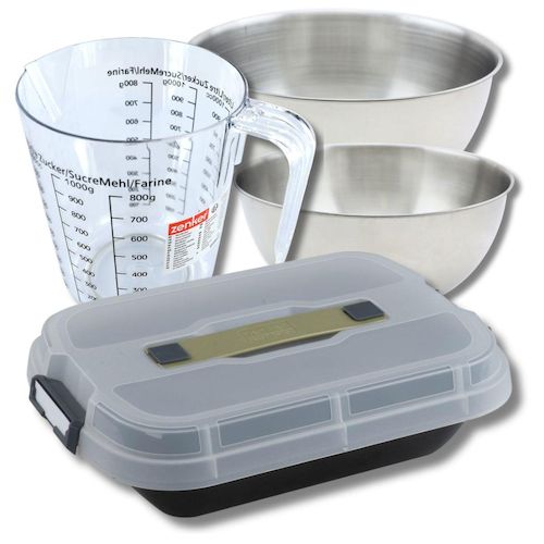 Set pâtisserie moule à gâteaux 34 x 24 cm avec couvercle, 2 bols à mixer, verre mesureur et spatule Zenker