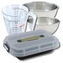 - DESCRIPTION: Set à pâtisserie avec un moule à rectangulaire 34 x 24 cm avec couvercle de transport, deux bols inox (25 cm et 20,5 cm), une spatule en silicone 25 cm, et un verre doseur 1L