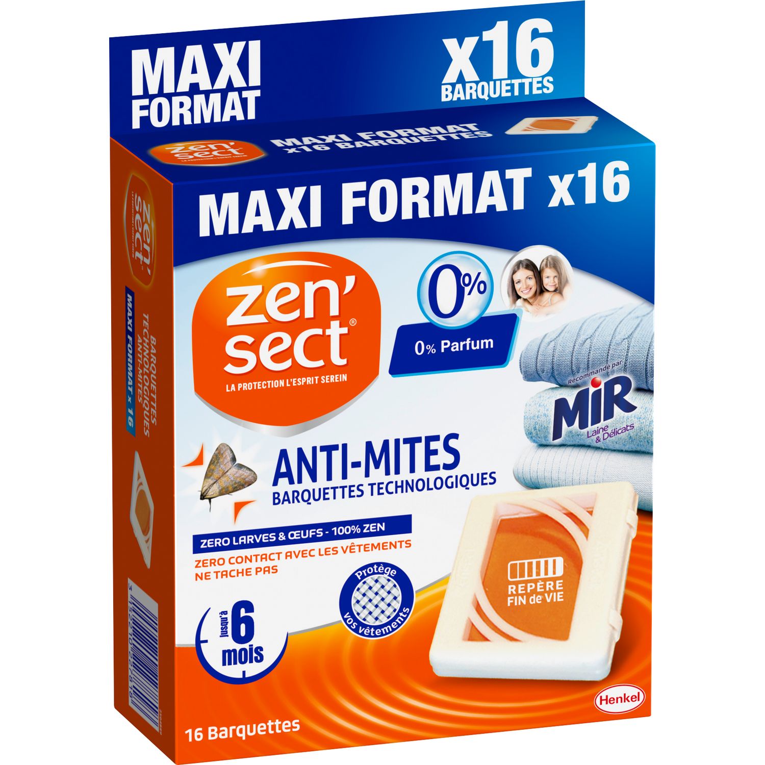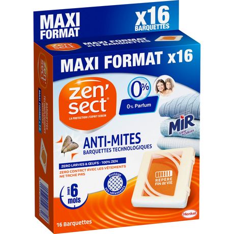 Les barquettes technologiques Anti-Mites ZEN'SECT éliminent efficacement et sans parfum les mites vestimentaires adultes, leurs larves et leurs oeufs jusqu'à 6 mois. Leur formule protège tous vos textiles (pulls, vestes, manteaux, fourrures, cuirs, ...) et ne risque pas de les tacher. Ultra-pratiques, les barquettes disposent également d'un repère de fin de vie qui vous permettra de savoir lorsqu'il sera temps de les changer. Ce maxi pack contient 16 barquettes. Produit dangereux, respecter les précautions d’emploi. Utiliser les biocides avec prudence. Avant utilisation, lire l’étiquette et les informations concernant le produit. ZENSECT ANTI MITES 16 BARQUETTES